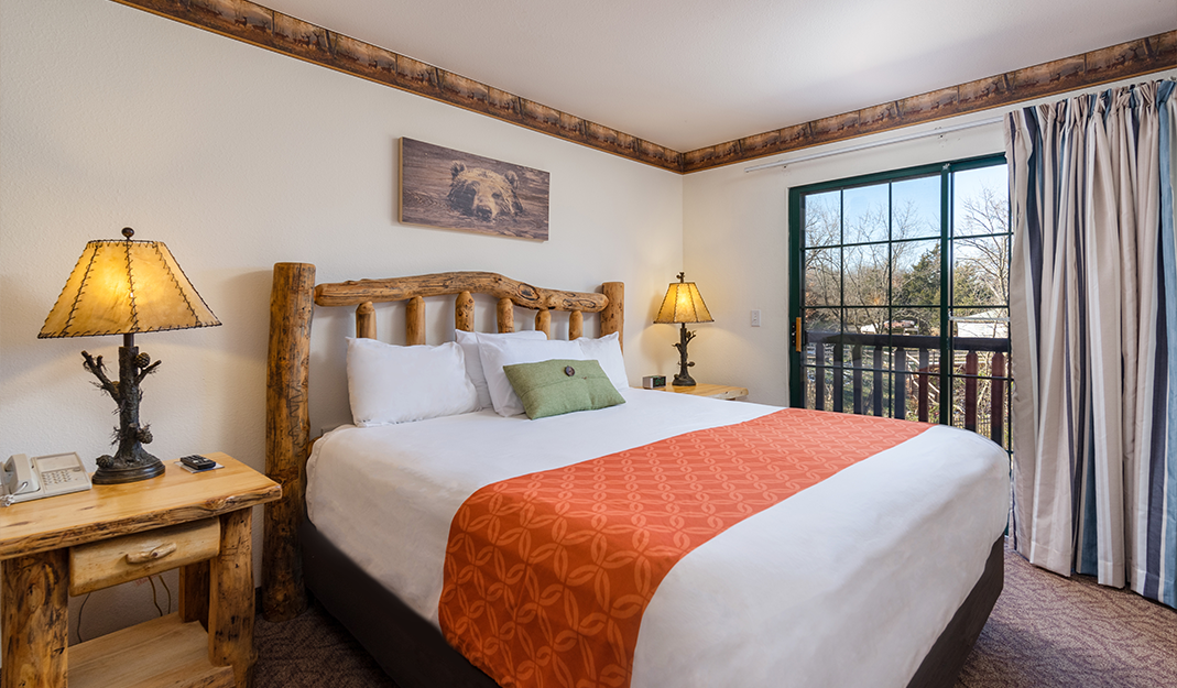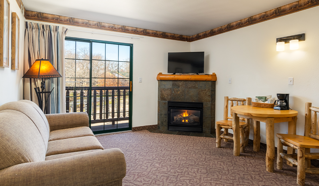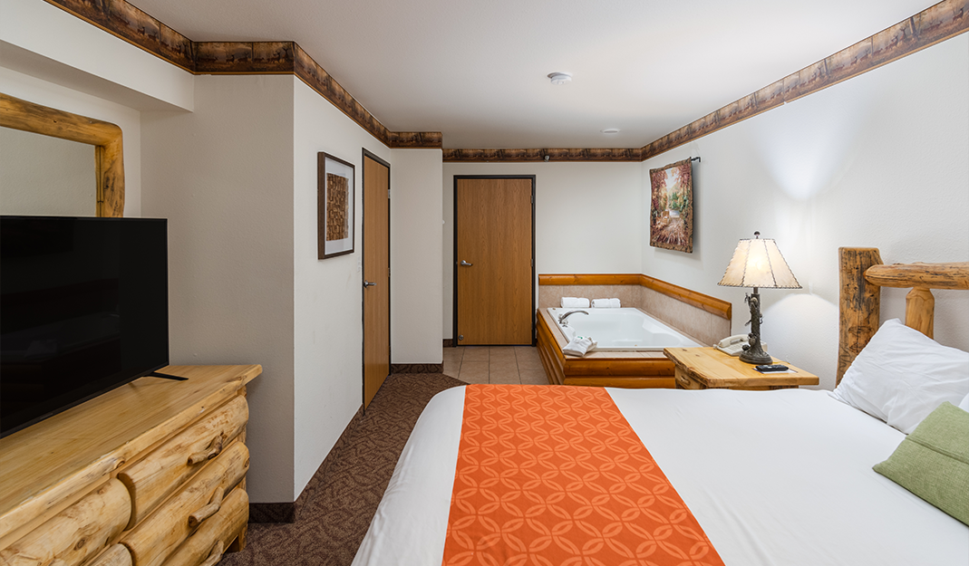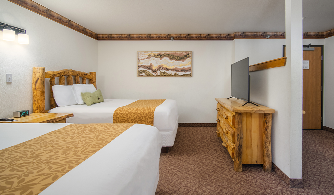 The Deluxe Family Suites are the most spacious in the lodge, with three rooms accommodating up to seven people. This suite offers three distinct sleeping areas with two queen beds and a queen sofa sleeper. The private master bedroom has its own two-person whirlpool tub and king bed. These suites also boast a living area, three TVs, all of our signature amenities and a cozy fireplace. Additional charges will apply to any number of guests above 6 (up to 7).
